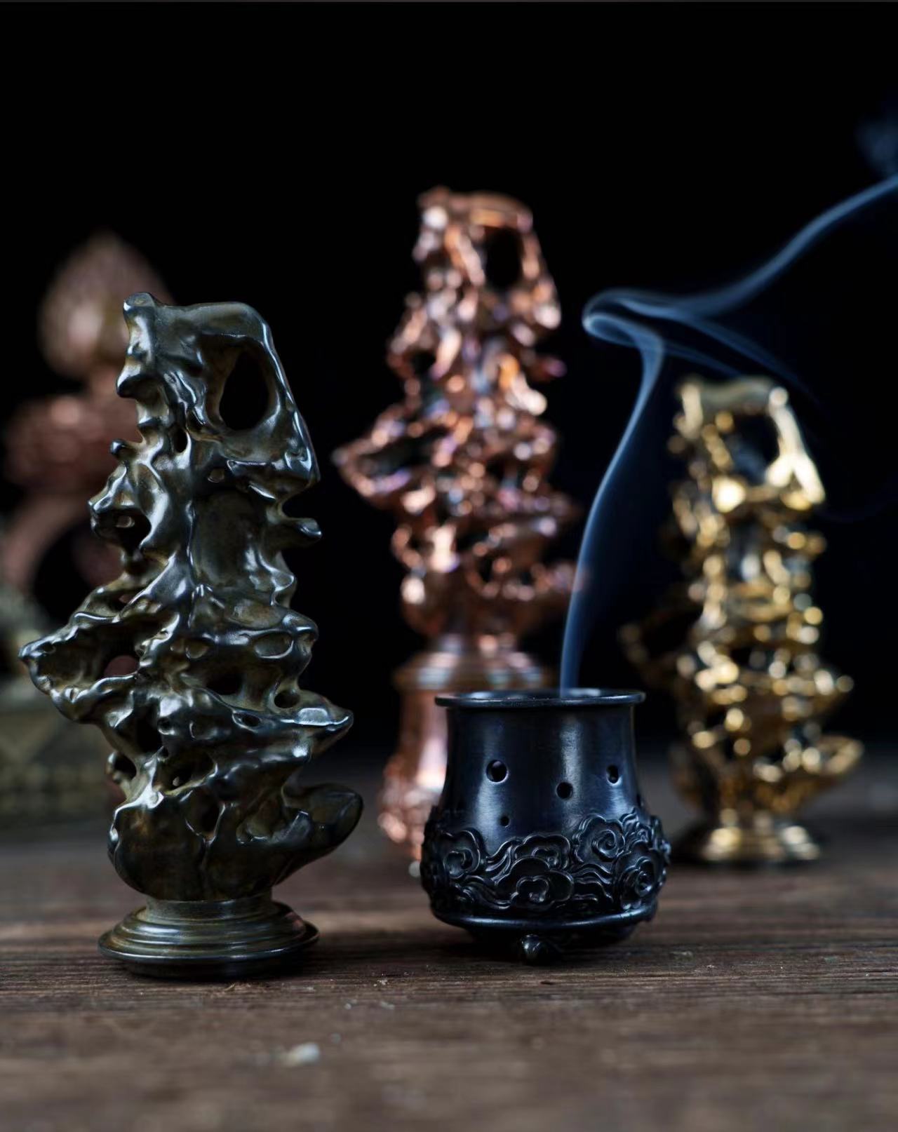 The elongated body creates a strong sense of height and balance, making it suitable as a desk ornament, tea-table object, or incense holder. When used with incense, smoke travels through the carved openings, emphasizing the stone’s layered structure and hollow depth.