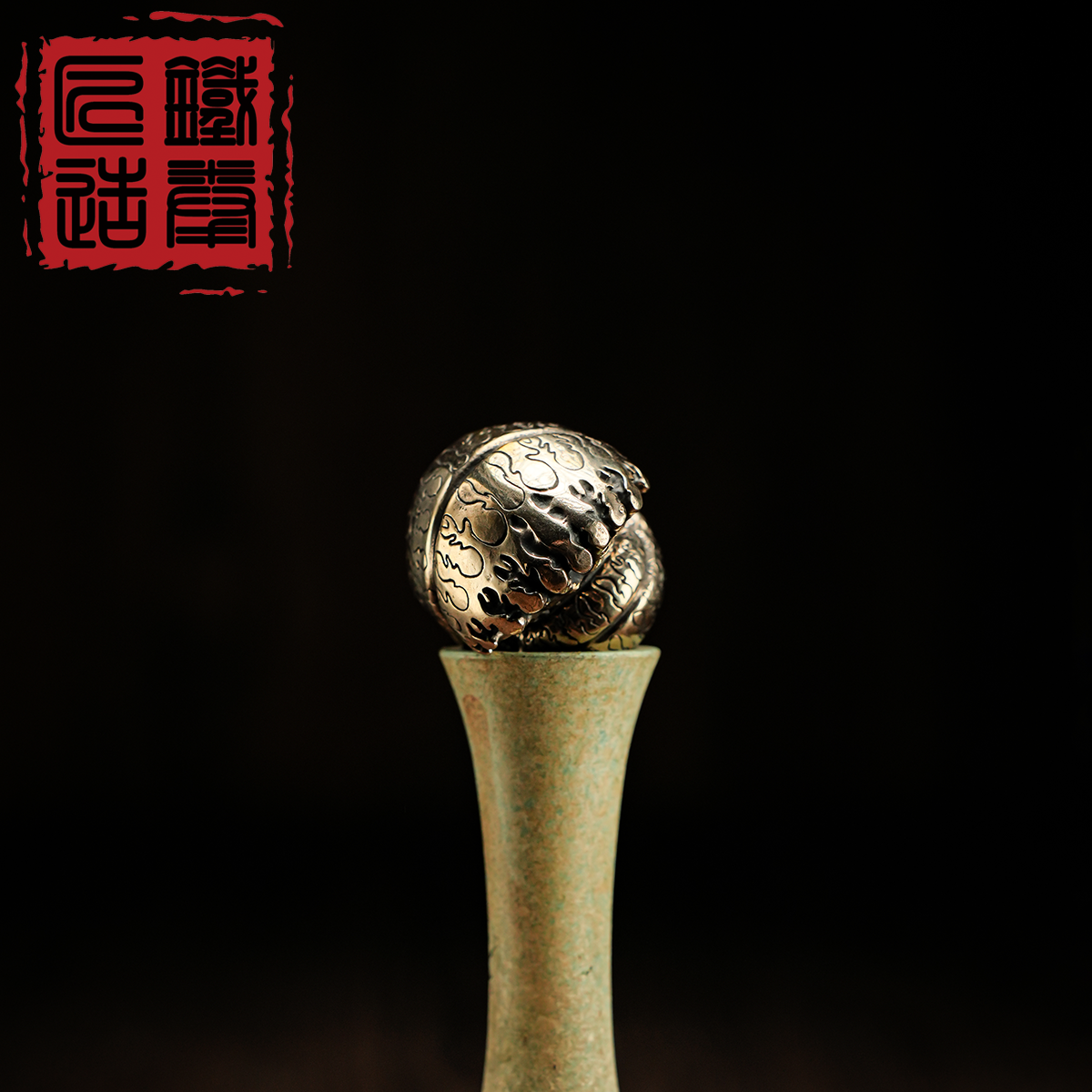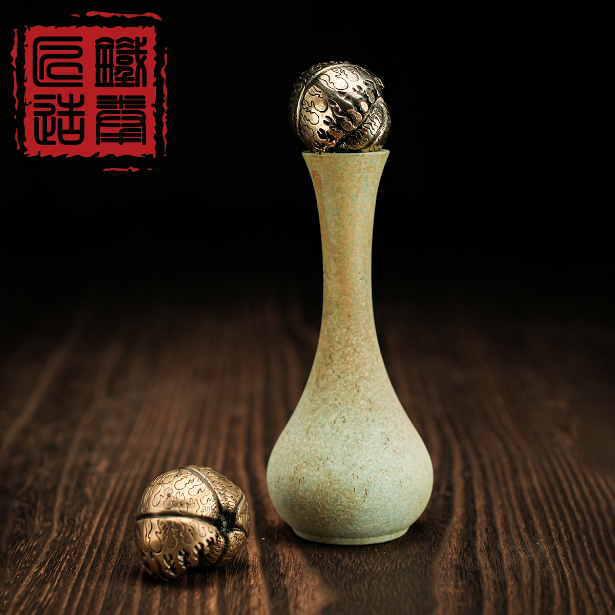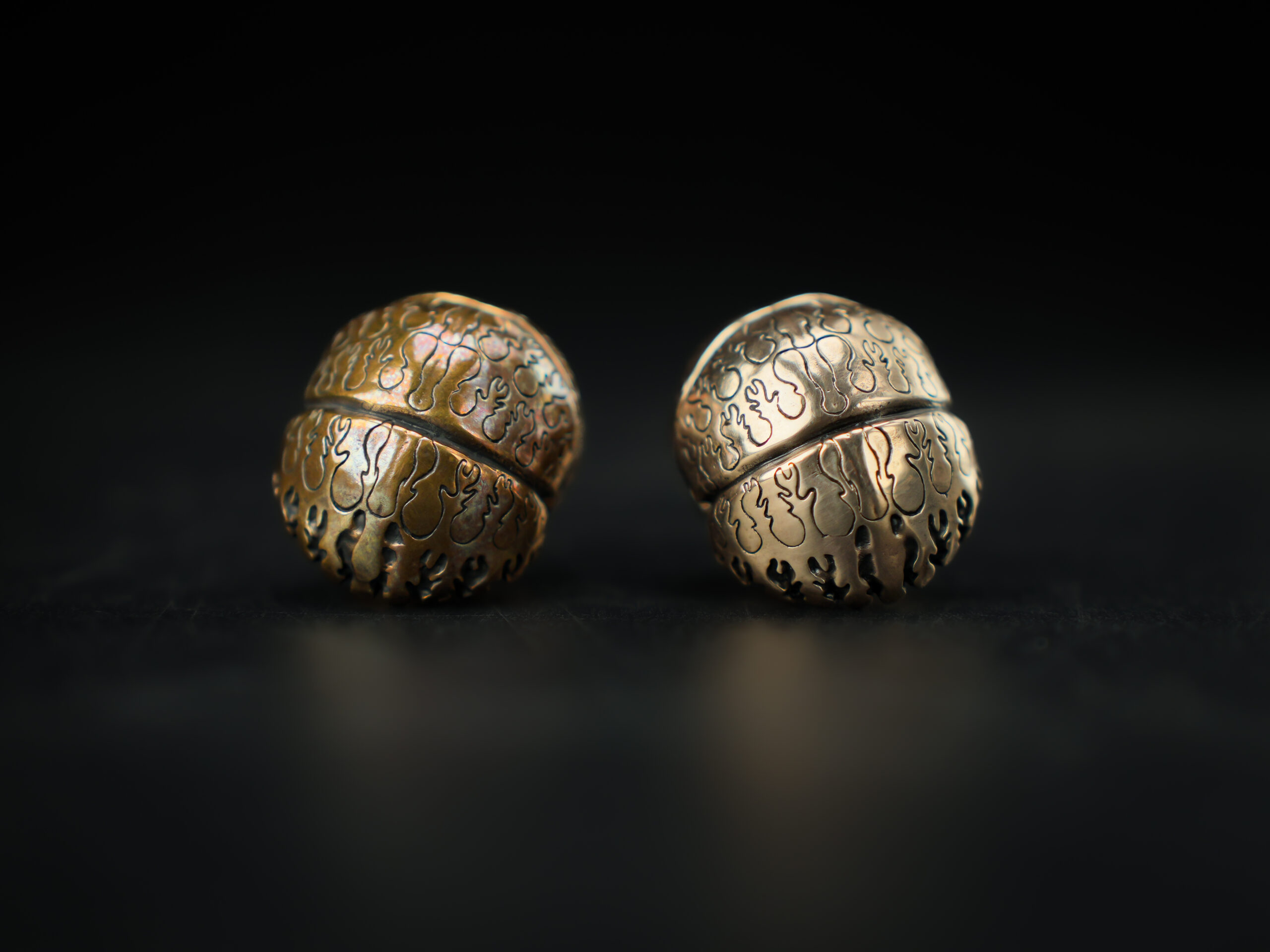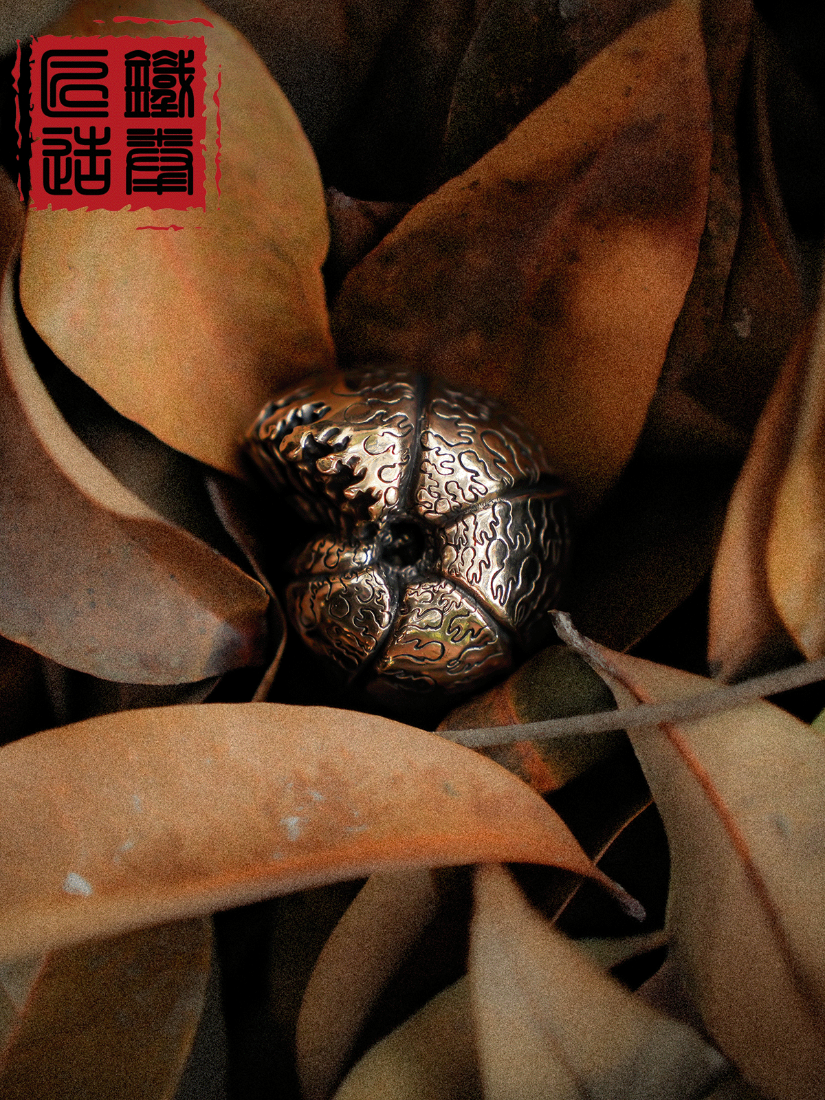 The surface is engraved with flowing organic patterns that echo natural growth lines, creating a tactile experience that changes subtly with light and handling. The spherical shape fits comfortably in the hand, making it suitable for repeated touch and rotation. Over time, contact with skin or tea water encourages the bronze to develop a unique patina, enhancing depth and character.