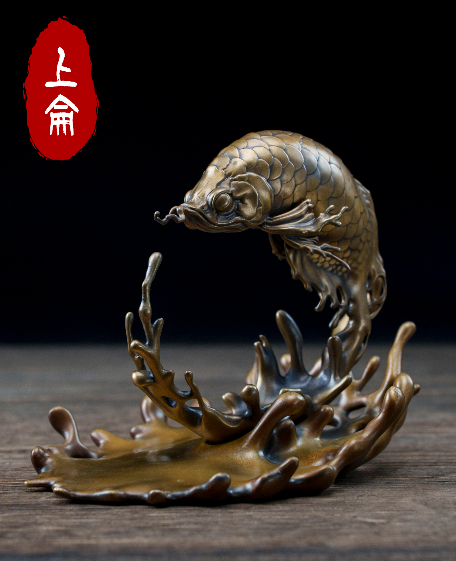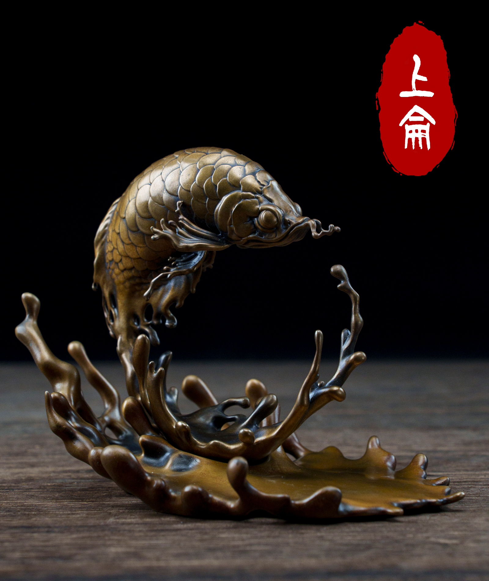 • A sculptural bronze object inspired by the form of a leaping fish.