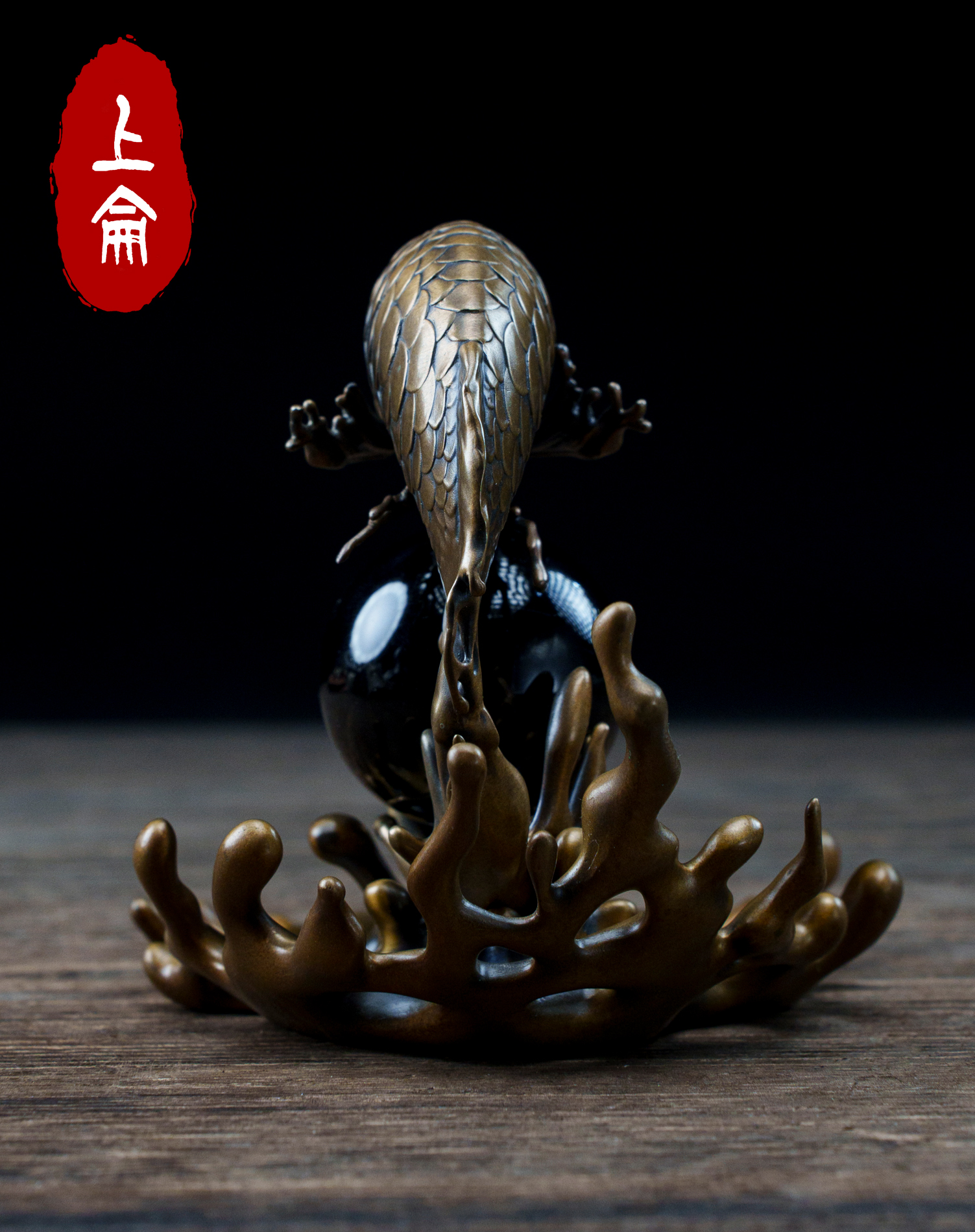 The Bronze Fish Incense Object captures the moment of a fish rising through water, its body arched above a dark central sphere. The surrounding splash-like base freezes motion into metal, creating a dynamic contrast between flow and stillness. The composition emphasizes upward movement, balance, and quiet tension.